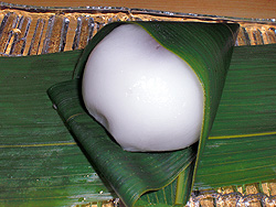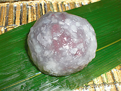 ![]() ▲涼菓 雪餅(1ヶ126円) 良質のくずの中に道明寺が入っており、とても涼しげな和菓子です。粒あんをつつみこんでます。 |